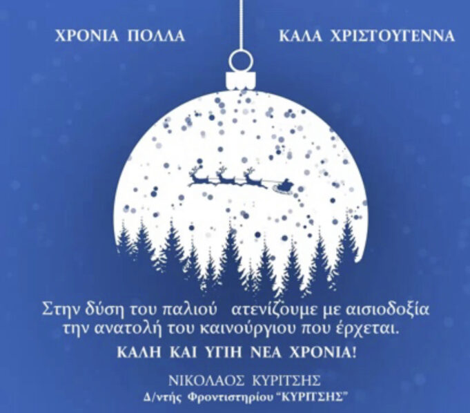 Στο κατώφλι για το πέρασμα στη νέα χρονιά και λίγο πριν τη Γέννηση του Θεανθρώπου, θα ήθελα να ευχηθώ στους καθηγητές, τους μαθητές και τις οικογένειες τους, να υποδεχτούμε όλοι με υγεία και ορθοφροσύνη το νέο έτος.