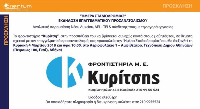Τα φροντιστήρια Μ.Ε. «Κυρίτσης» σε συνεργασία με την «Orientum – Σύμβουλοι Σταδιοδρομίας» σας προσκαλούν στην ανοιχτή εκδήλωση επαγγελματικού προσανατολισμού με θέμα: