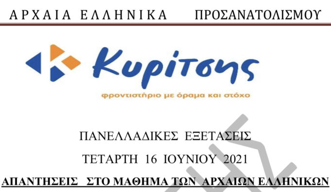 Το Φροντιστήριο Μ.Ε. «Κυρίτσης» σας παραθέτει τις απαντήσεις των θεμάτων στα Αρχαία Ελληνικά Προσανατολισμού, μάθημα που εξετάστηκε σήμερα 16/6/2021. Δείτε αναλυτικά στο αρχείο που ακολουθεί: