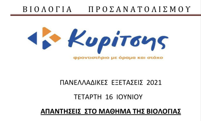 Το Φροντιστήριο Μ.Ε. «Κυρίτσης» σας παραθέτει τις απαντήσεις των θεμάτων στην Βιολογία Προσανατολισμού, μάθημα που εξετάστηκε σήμερα 16/6/2021. Δείτε αναλυτικά στο αρχείο που ακολουθεί: