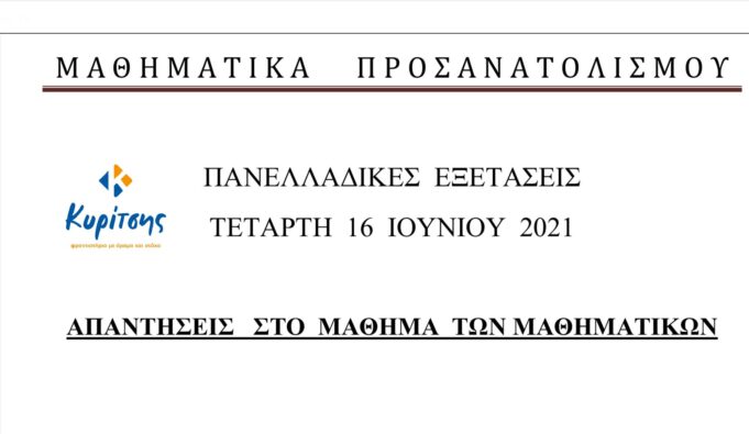 Το Φροντιστήριο Μ.Ε. «Κυρίτσης» σας παραθέτει τις απαντήσεις των θεμάτων στα Μαθηματικά Προσανατολισμού, μάθημα που εξετάστηκε σήμερα 16/6/2021. Δείτε αναλυτικά στο αρχείο που ακολουθεί: